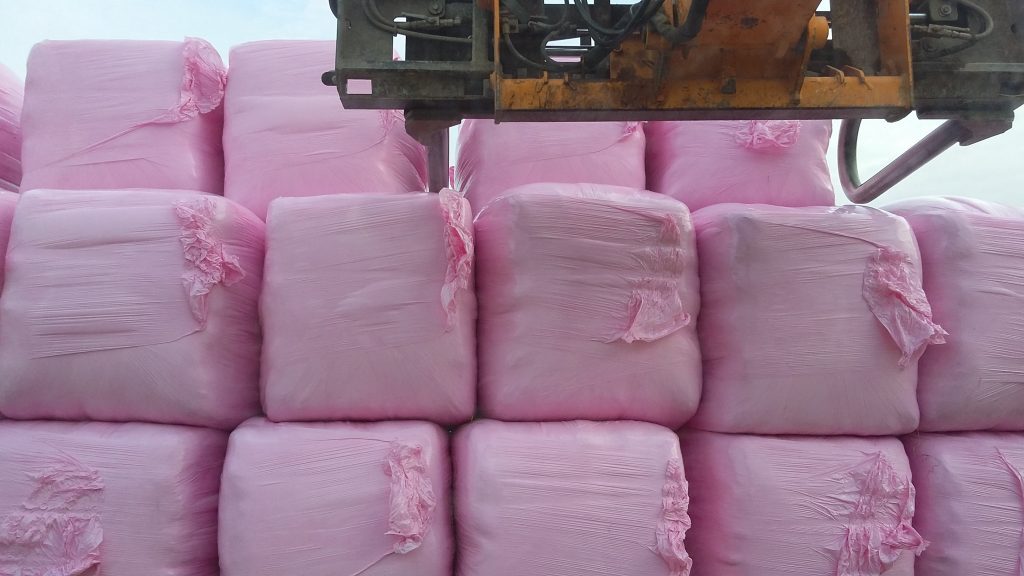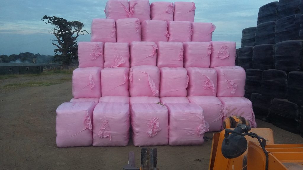 Haylage comes in large bales approx 4’6″ by 3′ by 3′ which can be manoeuvred by hand.